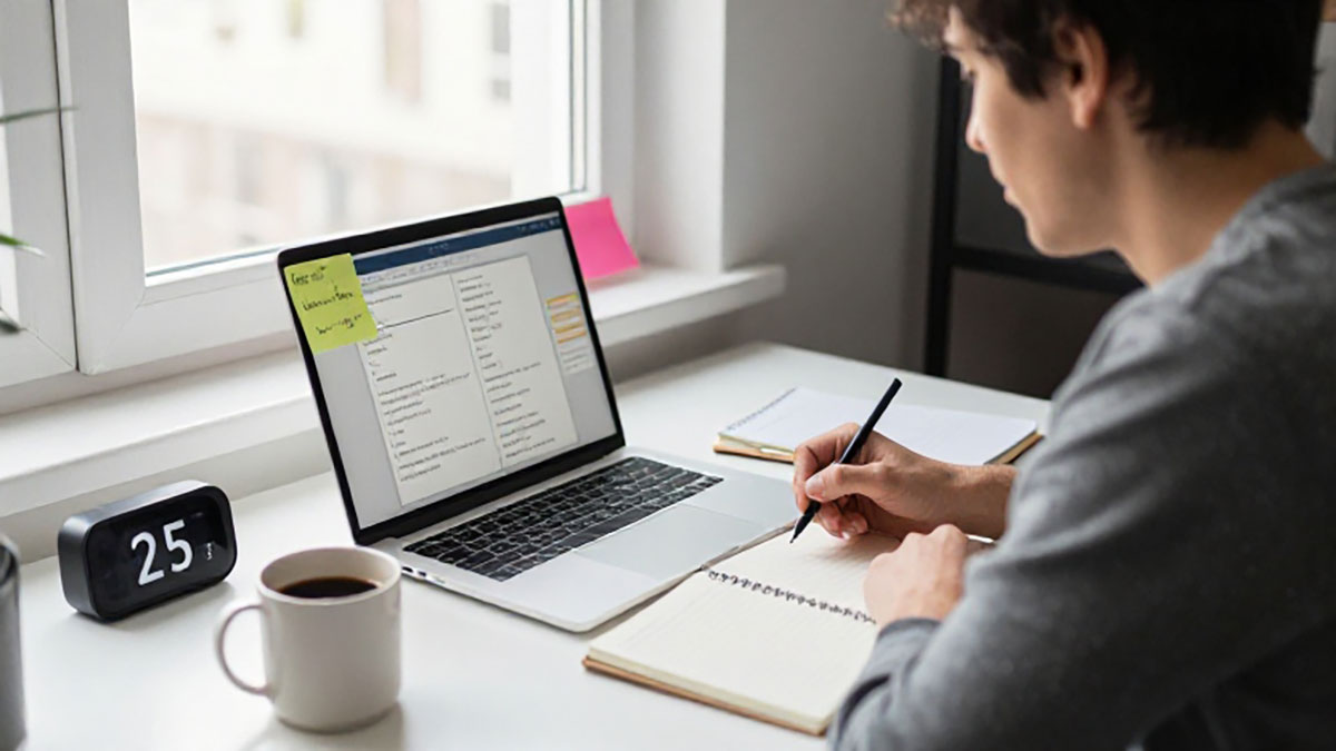 Freelancer sering menghadapi gangguan internal maupun eksternal, seperti notifikasi dari laptop atau rasa malas yang datang tiba-tiba. Dalam teknik Pomodoro, cara mengatasi hal ini adalah dengan menuliskan gangguan yang muncul di selembar kertas tanpa membiarkannya mengganggu sesi fokus. Misalnya, jika teringat email penting, tulis “cek email nanti” dan lanjutkan pekerjaan. Strategi ini membantu otak tetap fokus pada tugas utama sambil tetap mengakui adanya gangguan. Selain itu, ciptakan lingkungan kerja yang kondusif, seperti meja rapi, pencahayaan cukup, dan kursi nyaman. Lingkungan yang mendukung akan meningkatkan efektivitas setiap sesi Pomodoro.